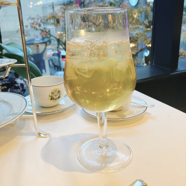 これはマリアージュフレールの創業の年を記念した銘柄であり、ジャスミンとアールグレイの爽やかなアロマが特徴です。淡い水色と相まって、濃厚なスイーツプレートを楽しんだ後の口内を、優しく爽やかにリセットしてくれます。